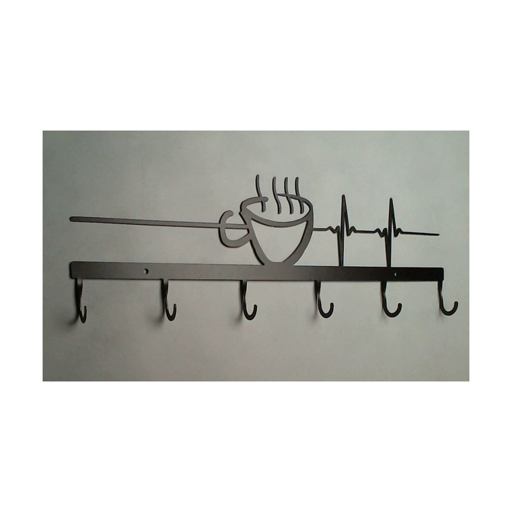 Six hook coffee cup rack featuring a life line through a coffee cup. Standard paint color is black but this is a made to order custom item so request the color of your choice. Item is cut and formed from 14 gauge steel and is about 23 inches wide and 8.5 inches tall while hooks will stick out from wall about 1.5 inches. Remember all custom items take 1-2 weeks to complete, if you need faster, please ask and I will see what I can do.