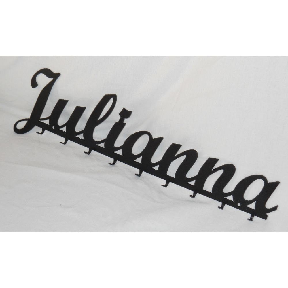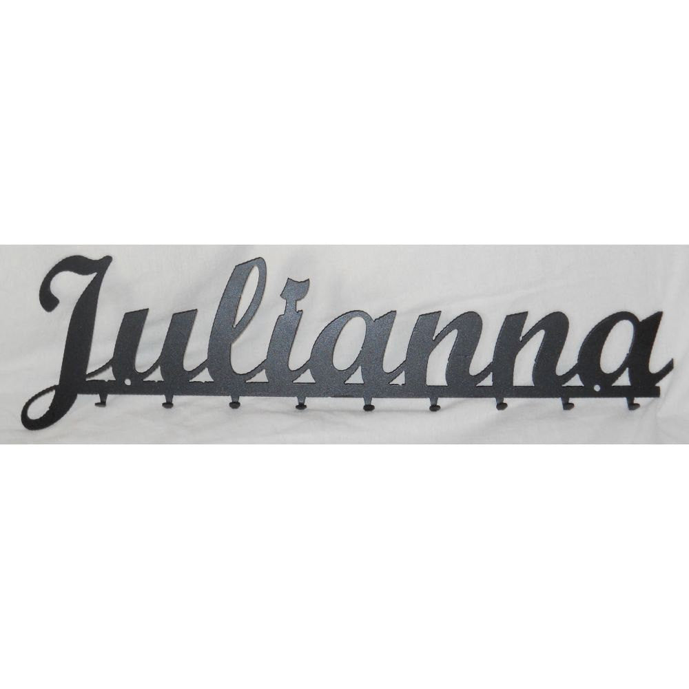 Custom belt/key rack with name above 9 key/belt hooks cut from .074 inch thick steel and painted black. Item is about 20 inches wide by 5 inches tall. Put name you want on rack in the buyers note.