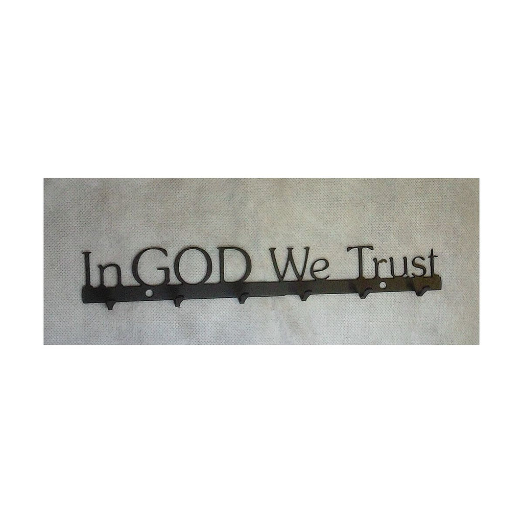 In GOD We Trust key rack cut from .074 inch thick steel and painted black. Item is about 12 inches wide by 3 inches tall. Has 6 hooks for hanging keys.