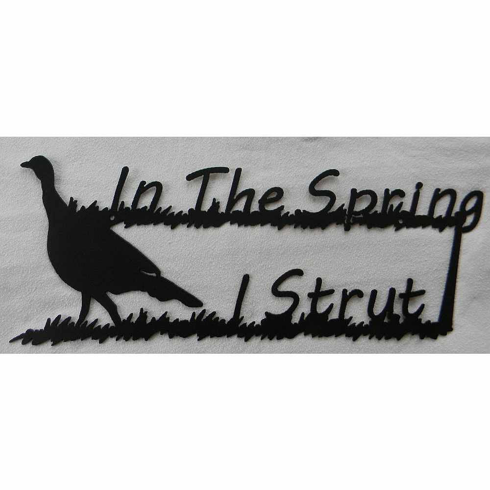 Turkey with phrase "In the Spring I Strut" cut from .074 inch thick steel and painted black. Item is about 20 inches wide by 8 inches tall. See the companion sign "In the Fall I Rut". Any item can be customized so ask for a quote if you want to add a name or change the depiction.