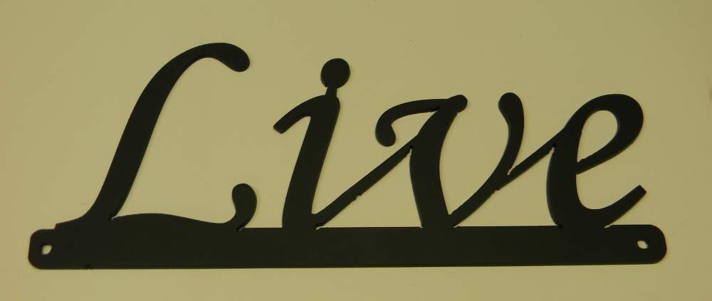 Inspriational Words - Live Sign cut from 14 gauge steel and painted black. Script text on top of a bar. Sign is 11 inches wide by 4 inches tall.