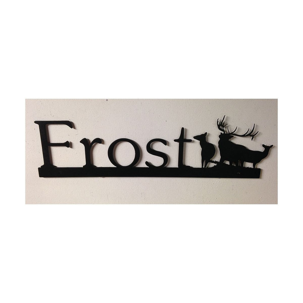 Elk sign with name cut from 14 ga. steel. Sign is 20 inches long by 6 inches tall. Standard color is textured black, other paints that I keep on hand are oil rubbed bronze, flat iron gray, and metallic nickel. All items are made to order and take 2-3 weeks o process through paint cure but if you need it faster, please ask, I an change processes to dry paint faster.