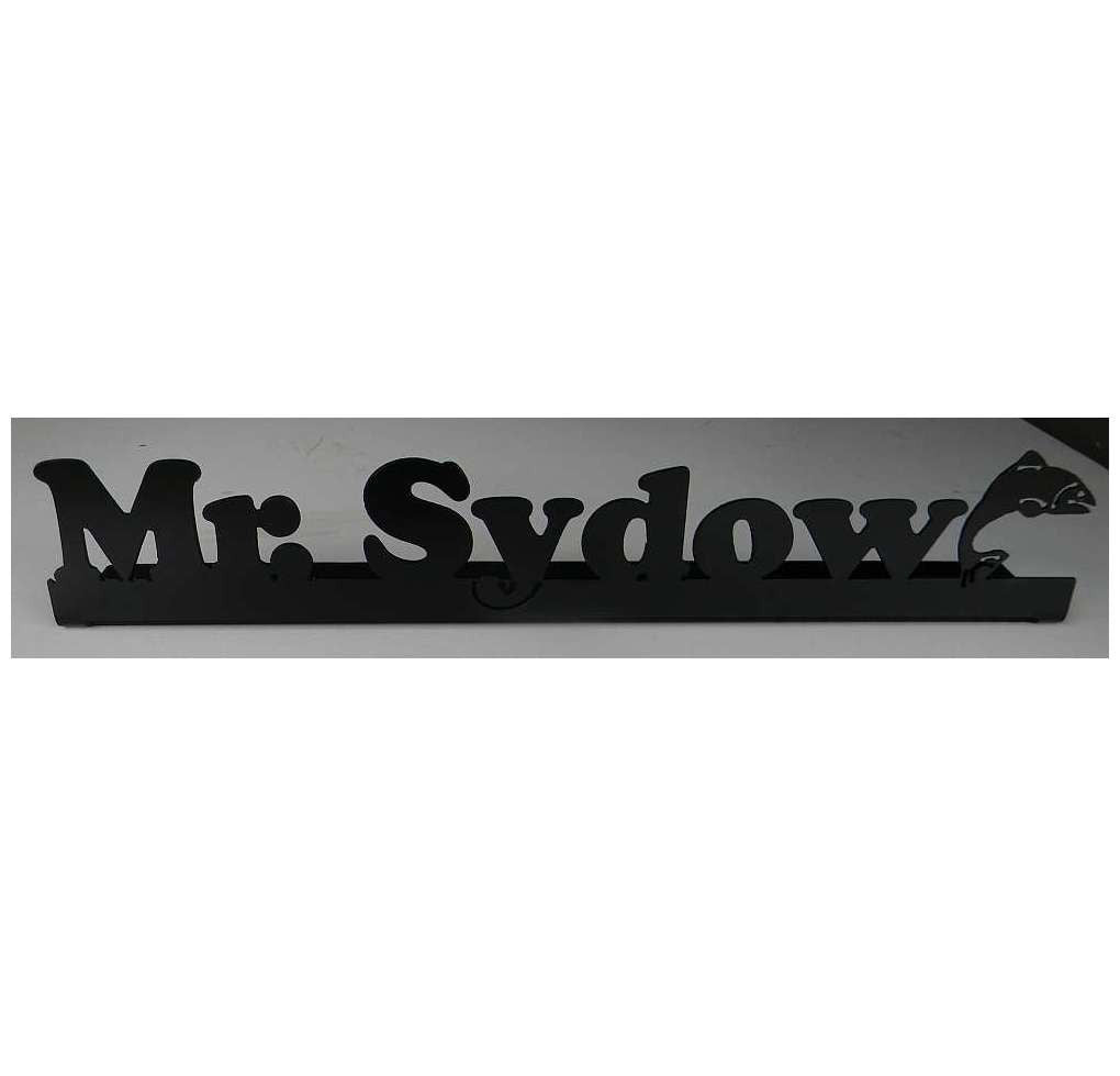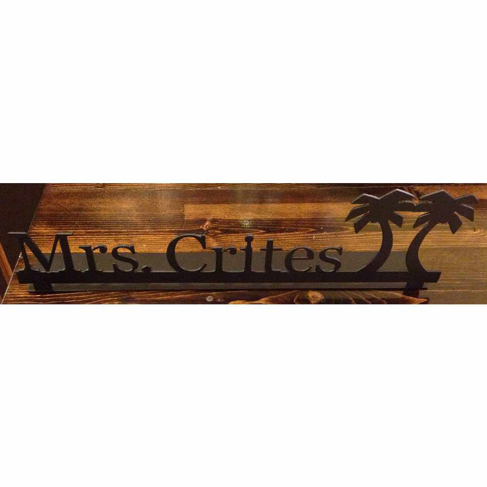 Personalized desk sign with name and custom depiction. Example has "Mrs. Crites" and palm trees for a teachers desk. Ask me for what you would like to see and I will let you know if I can do it. Sign is about 20 inches long and letter height can range from 1.5 to 2 inches tall to fit that length.