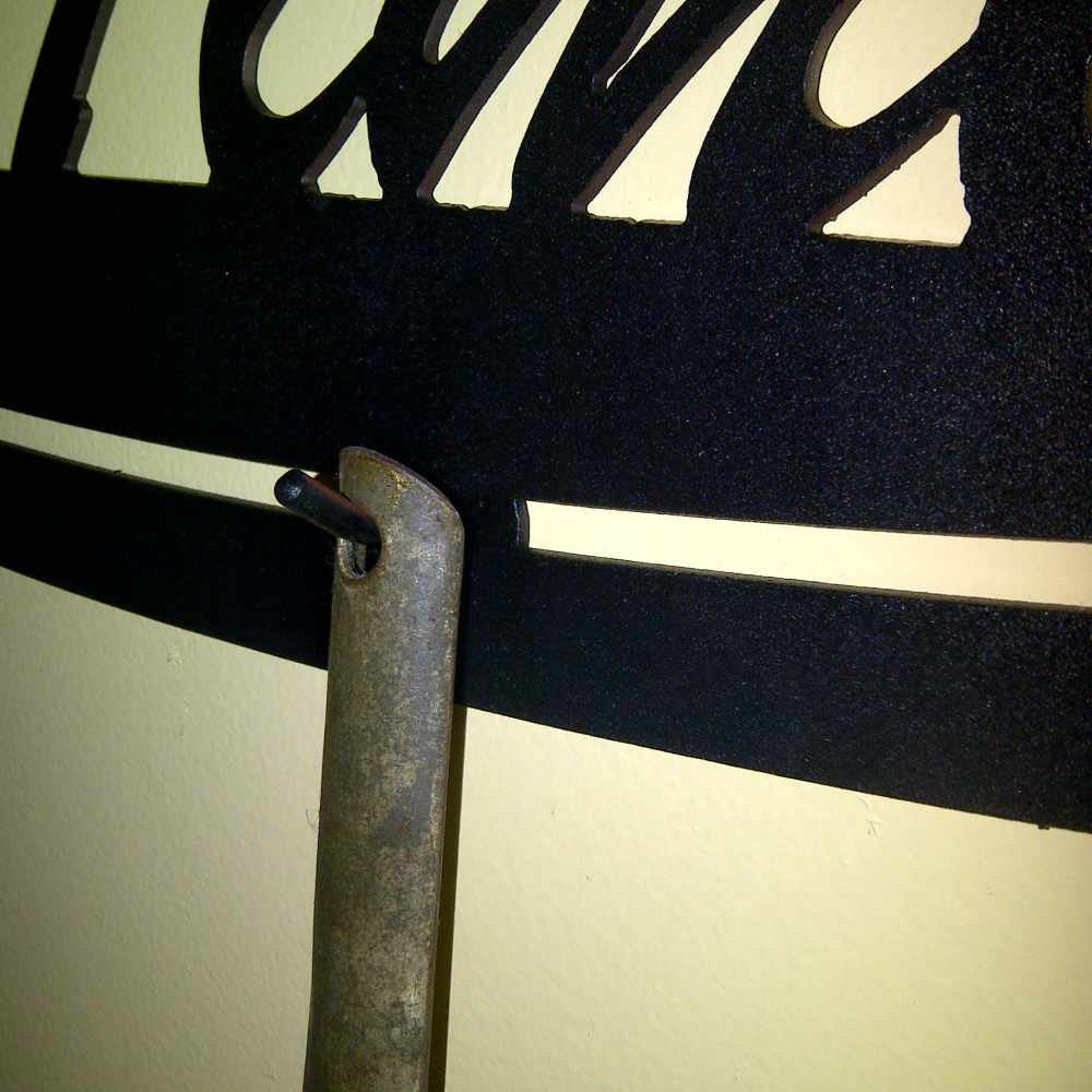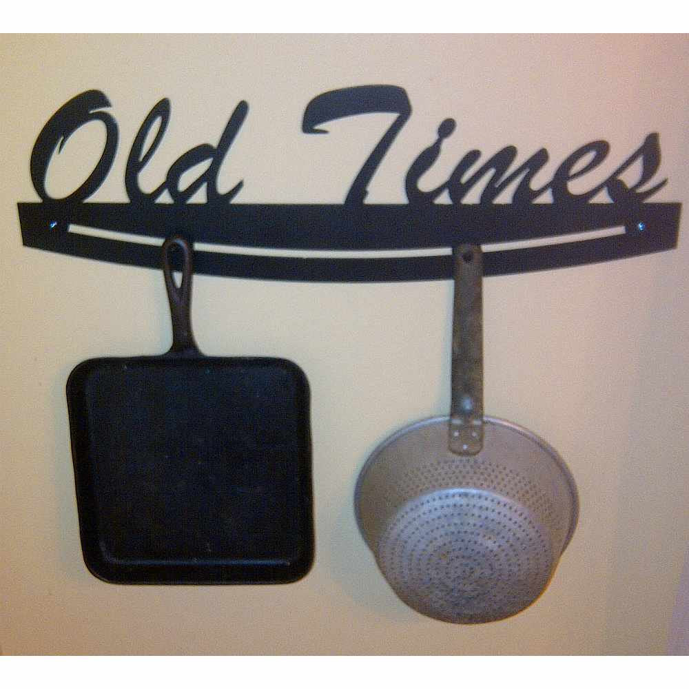 Pots and Pans rack with 3 hooks with adjustable spacing cut from .074 inch thick steel and painted black. Item is about 22 inches wide by 7.5 inches tall and the hooks stand out from the wall about 2 inches. The hooks are made from 3/16 inch rod bent slightly upward and welded to a small back plate allowing them to be positioned in the slot of the sign until it is firmly mounted to the wall. Any item can be customized so ask for a quote if you want to add a name or change the depiction.