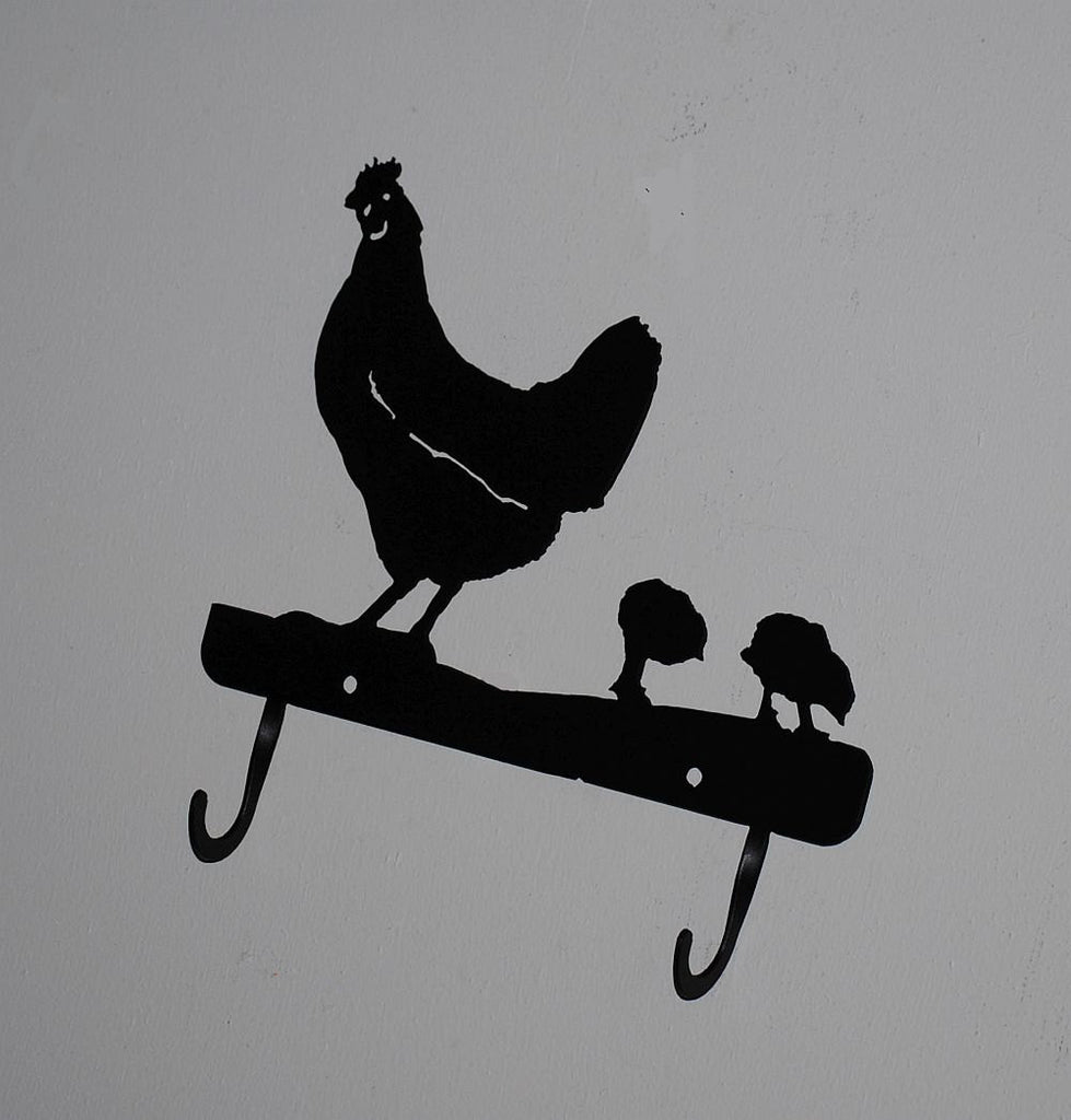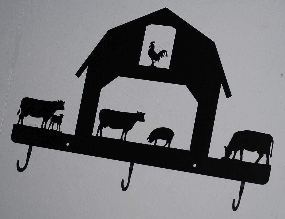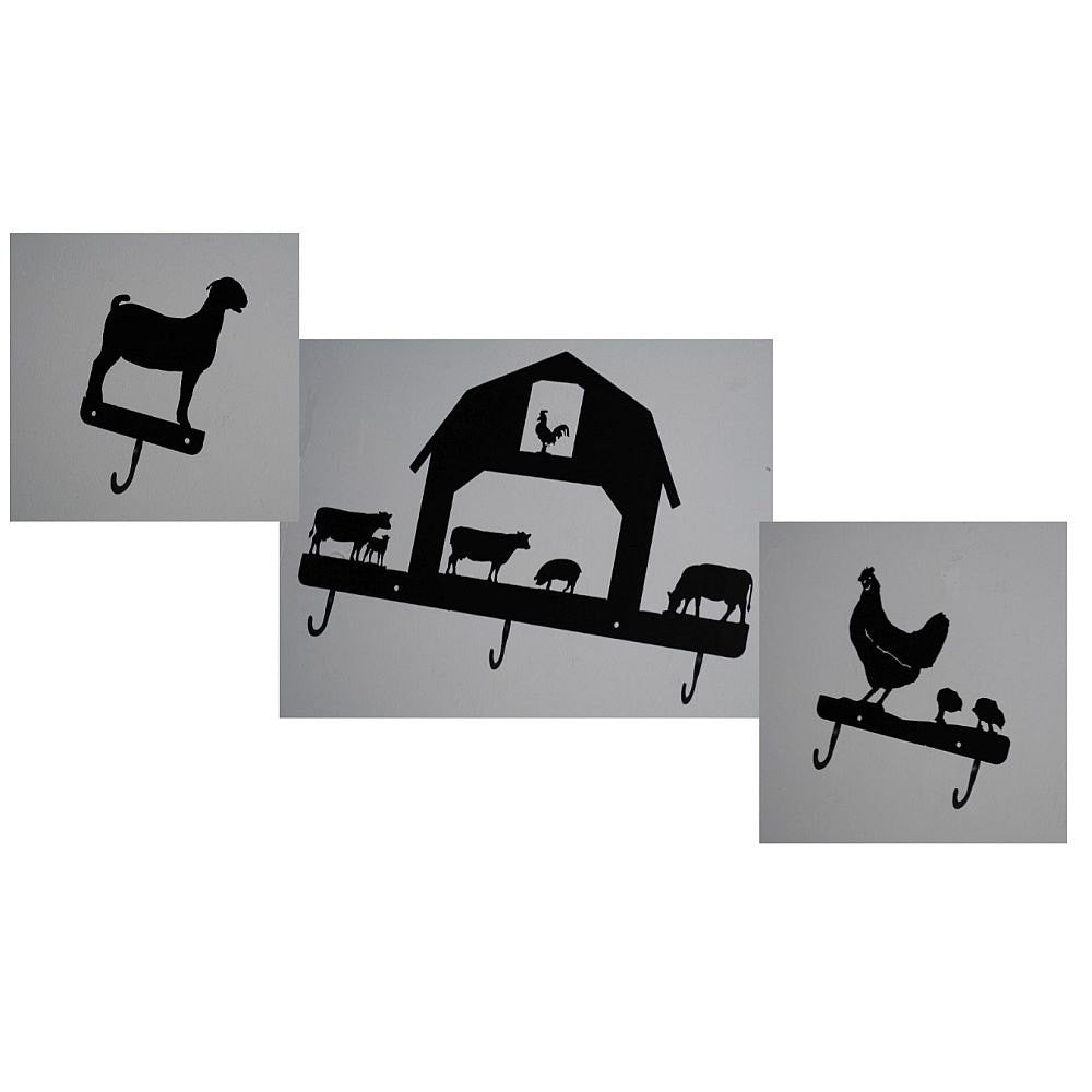 Set of 3 pot hooks with farm theme totaling 6 hanging hooks. Includes all 3 pieces made from steel and painted black. Barn piece is 22 inches wide by 15 inches tall and hooks are 9 inches apart. Chicken and chicks piece is 10 inches wide by 10 inches tall and hooks are 7 inches apart. Sheep piece is 6 inches wide by 10 inches tall with 1 hook.