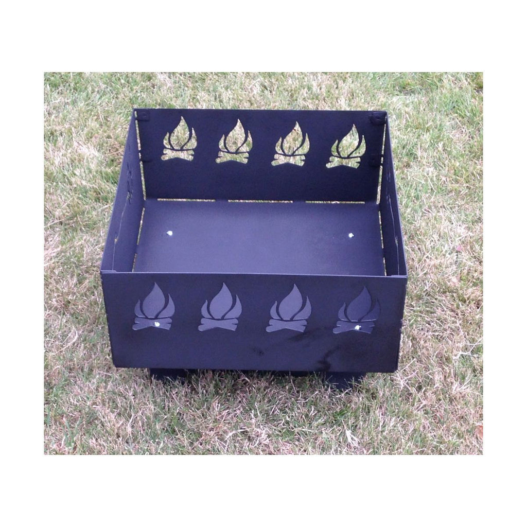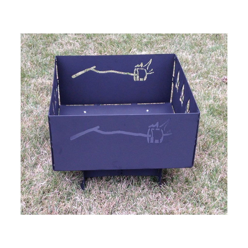 Fire pit smaller version with 2 sides depicting a marshmallow stick and two sides scrolling campfires. You can request side words or images, just ask. Pit area is 18 inches by 18 inches and 8 inches deep with base that attaches with supplied bolts that will place the bottom of the pit 6 inches off of the ground. Top ledge of pit will be 14 inches off of the base surface. Pit is painted with high heat black paint but will develop a rust patina over time due to the heat from the fire. Made from 14 gauge steel for a years of use. Want a larger fire pit, check out our 22 inch custom pits.